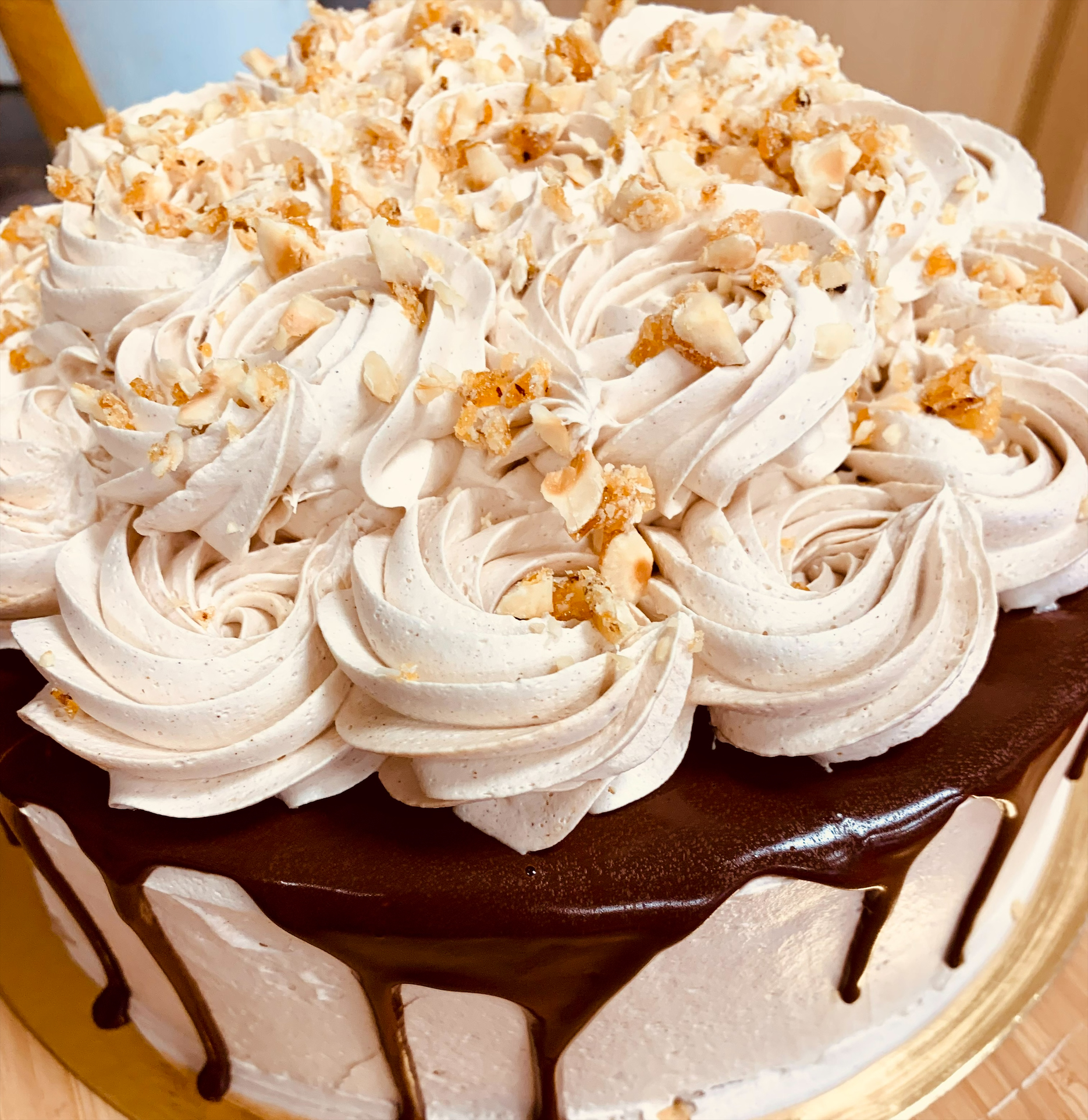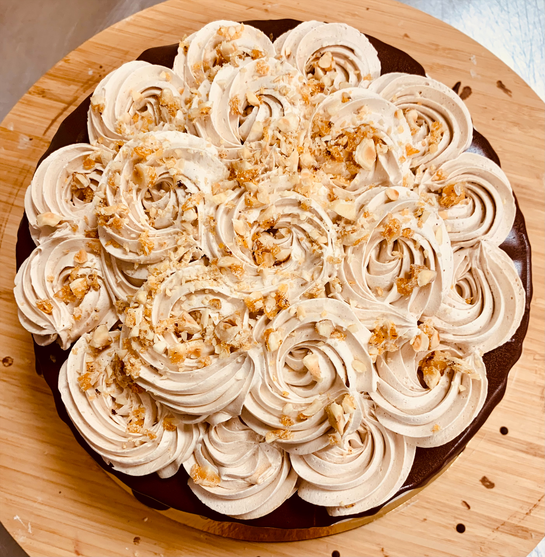 Tartas con crema en rosetones perfectos, acabado drip de chocolate negro y toppings caramelizados. Elegancia y sabor en cada capa.